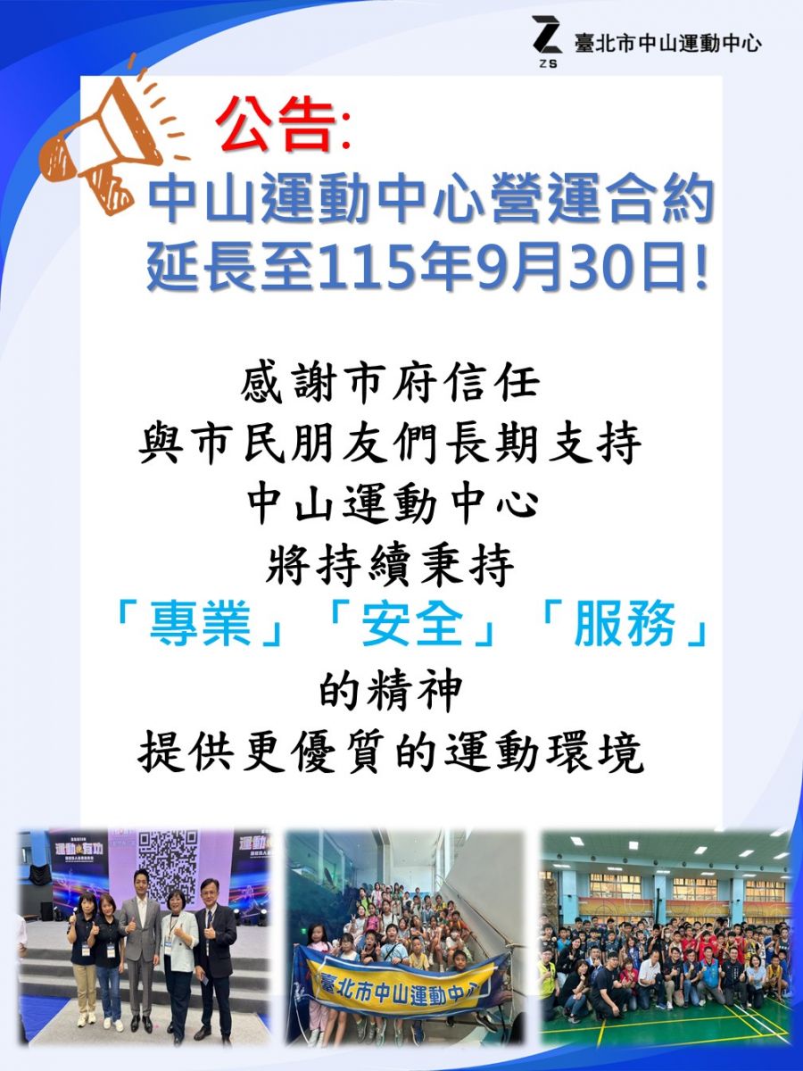 跟各位市民朋友延長我們的緣分 中山運動中心營運合約延長至115年9月30日 感謝市府信任與市民朋友們長期支持, 中山運動中心將持續秉持, 「專業」、「安全」、「服務」的精神, 提供更優質的運動環境。 後續我們會有驚喜優惠方案和冬令營營隊課程,敬請期待!!