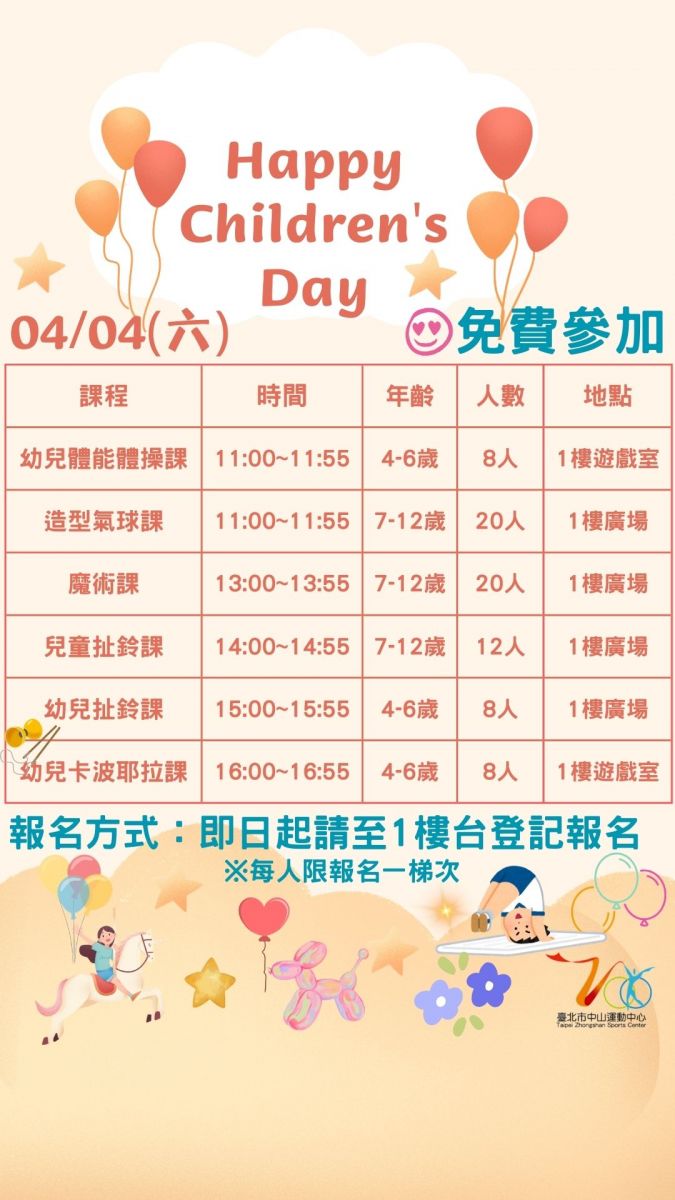 兒童節限定|免費體驗課開放報名 孩子的快樂,就從運動開始! 今年中山兒童日推出 兒童節限定免費體驗課,讓孩子一次體驗多種超人氣運動,在專業教練帶領下盡情玩! 限在中山運動中心櫃台現場報名,打電話不能報名唷~ 多元運動體驗 快樂學習提升自信 給孩子最棒的兒童節禮物:健康、快樂與滿滿成就感! 完全免費|名額有限|額滿即止|每人限報名1梯 還有機會得到神秘優惠券唷~ 想讓孩子一起來玩運動、交朋友、發現自己的潛力嗎? 現在就幫孩子報名,一起來過最有活力的兒童節!